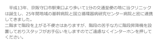 高橋クリニック 大阪府守口市桜町6-8 守口駅前敷島ビル2F TEL:06-6995-7528