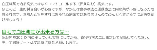 HOME | ごあいさつ | 診療案内 | 各医師の紹介 | よくある質問 高血圧で初めて受診される方へ |  地図・アクセス  |  リンク | データ送信 |